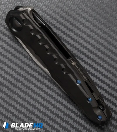 This Sigil has a DLC black finished 6Al4V titanium handle with blued titanium hardware and a blued Damascus steel stop plate. The backstrap has the Marfione Dagger, makers, serial number, and date of production. The blade is hand ground, hand rubbed Elmax steel.