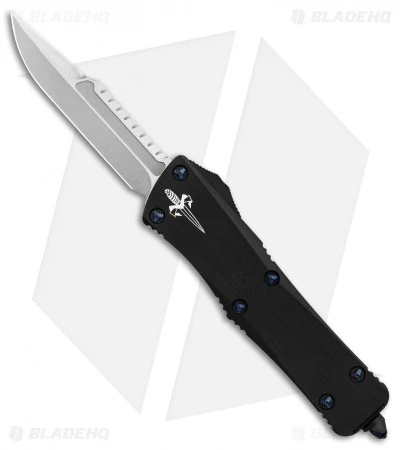 This Marfione Custom Troodon automatic knife features an Interceptor blade made from Bohler M390 stainless steel with a two-tone stonewashed finish. It has an anodized alloy handle and blue anodized titanium hardware. The model, date, and Marfione Dagger are found on the handle. Includes a certificate of authenticity.
