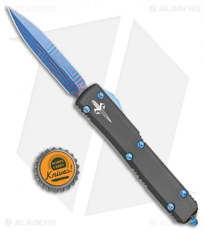 This hollow-ground Ultratech from Marfione Custom features a unique blue mosaic damascus blade paired with a sleek aluminum handle. The knife is outfitted with blue anodized ringed titanium hardware. Matching blue thumb slide, glass breaker, and a bronze finished pocket clip.