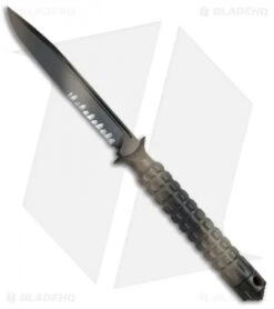The A.D.O. (Alpha Detachment Operative) is an extraordinary fixed blade knife from Microtech. This ADO features a tan camo finished single edge blade (serrated) and handle with a waffle-style texture. This knife follows the design of Chris Reeve fixed blades with a hollow handle, accessed by unscrewing the glass breaker tip. It is made from a solid billet of stainless steel. The A.D.O. includes a composite sheath with a spring loaded tab to secure knife and a 2″ steel clip for belt carry.