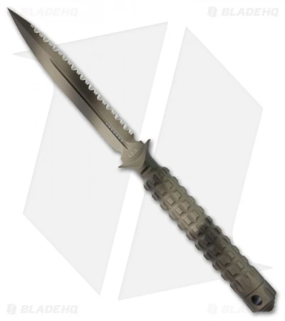 The A.D.O. (Alpha Detachment Operative) is an extraordinary fixed blade knife from Microtech. This ADO features a stealth camo finished double-edge dagger blade and handle with a waffle-style texture. The blade is fully serrated on one edge and plain on the other. This knife follows the design of Chris Reeve fixed blades with a hollow handle, accessed by unscrewing the glass breaker tip. It is made from a solid billet of stainless steel. The A.D.O. includes a composite sheath with a spring loaded tab to secure knife and a 2″ steel clip for belt carry.