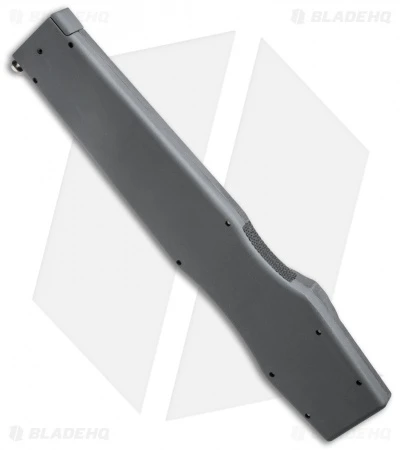 The CFO features a bead blast finished ATS-34 stainless steel blade with a sharpened upper edge. The blade on this single action out-the-front automatic knife fires with a push of the front mounted firing button and is released by pushing the button, followed by a pull of the charging handle at the base. The aluminum handle features grip inserts at the grooves. In addition, this model features a carbon fiber firing button insert!