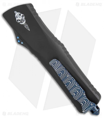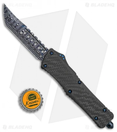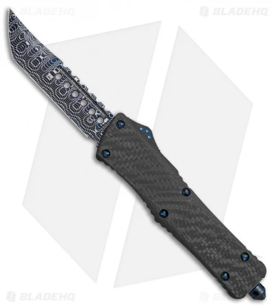 This Hellhound Ultratech from Microtech features a tanto blade made from blued Vegas Forge damascus and a carbon fiber top handle scale. The blade comes in a Hellhound tanto profile accentuated by rich Spirograph damascus from Vegas Forge. Ringed titanium hardware and a matching damascus pocket clip finish off the custom design.