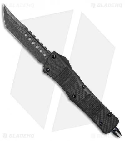 This Hellhound Ultratech from Microtech features a damascus tanto blade and a carbon fiber top handle scale with blue ringed titanium hardware. The blade comes in a Hellhound tanto profile accentuated by rich damascus steel.