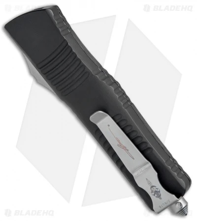 This Combat Troodon automatic knife features an apocalyptic finished M390 steel Hellhound Tanto blade and a black anodized 6061-T6 aluminum handle with a carbon fiber scale and bead blasted hardware. The model, date, and Marfione Dagger are found on the pocket clip. Includes a certificate of authenticity.