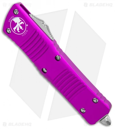 This Combat Troodon has a double edge dagger blade with a satin finish and one fully serrated edge. The handle is violet anodized aluminum with bead blast finished steel glass breaker, pocket clip and hardware.