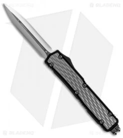 This Microtech Daytona out-the-front knife is a spectacular piece. It has a Anthony Marfione hand ground, mirror polished double-edge dagger blade. The handle is black anodized aluminum and has stainless steel diamond bubble plate inserts on the front and back. It sports a double breaker tip and pocket clip.