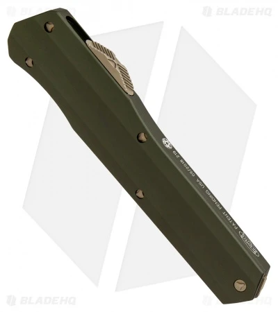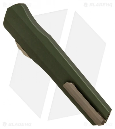 The Microtech Cypher OTF is a production version of the popular A. Marfione / D.C. Munroe custom collaboration. This model is equipped with a Katana single-edged blade. Its handle is made from lightweight aluminum with an OD green anodized finish and a bronzed titanium milled pocket clip and endpiece.
