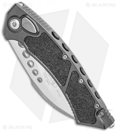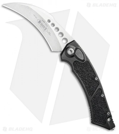 Microtech Hawk knives are aggressive karambit-esque automatics that scream tactical. The Hawk is a well thought out knife with fast, hard-hitting action and solid lockup. It’s also got a glass breaker and a lanyard hole. The anodized 6061-T6 aluminum handle has black traction inserts, blasted hardware, and a tip-up pocket clip.