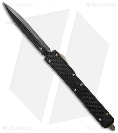 The Microtech Makora II knife fires in and out automatically via the sliding firing button the the knife’s right side. The handle is black anodized 6061-T6 aluminum with a carbon fiber insert front and back. The double edge blade is black DLC finished stainless steel with plain cutting edges and marked with the Claw logo and date. This Makora II has bronzed hardware, pocket clip, and glass breaker. The action on this knife feels exceptional.