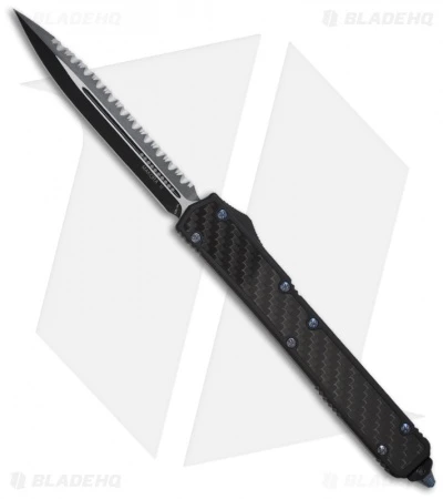 The Microtech Makora II knife fires in and out automatically via the sliding firing button the the knife’s right side. The handle is black anodized T-6 aluminum with carbon fiber insert front and back. The double edge blade is black DLC coated S35-VN steel with one fully serrated edge. This Makora II has a black finished pocket clip for easy carry. The action on this is exceptional and we think the Makora series represents the Microtech line well. The screws on these are custom and cannot be opened with either torx or standard Tri-wing wrench sets. You must use the tool sold HERE.