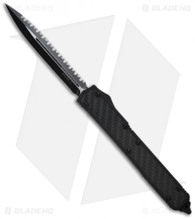 The Microtech Makora II knife fires in and out automatically via the sliding firing button the the knife’s right side. The double edge blade is black DLC coated Elmax steel with one fully serrated cutting edge. This Makora II has a black anodized T-6 aluminum handle with carbon fiber inserts front and back. The hardware, pocket clip, glass breaker and firing button are all tactical black finished. The action on this run feels exceptional and we think the Makora series represents the Microtech line well. The screws on these are custom and cannot be opened with either torx or standard Tri-wing wrench sets. You must use the tool sold HERE.