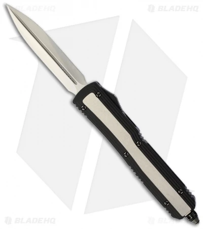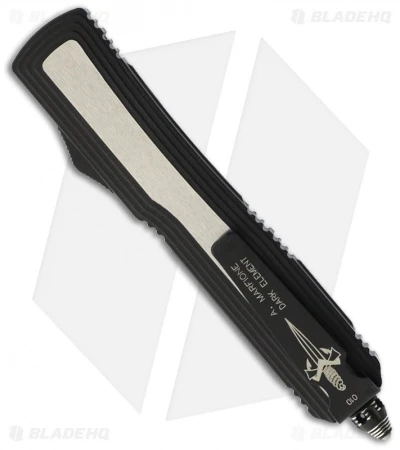 The Microtech Dark Element is a very rare Marfione Custom knife with a design based on elements of the popular Ultratech series. This Element features a two-tone stainless steel frame; black with satin faces. Black glass breaker tip and pocket clip with the Marfione Dagger logo, serial number, model and maker (A. MARFIONE). The double edge blade is hand ground and satin rubbed. The Element includes a black nylon zipper case.
