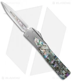 The Marfione Custom UT-10 makes its debut after an initial prototype last year. It’s a spectacular OTF, based on the Ultratech chassis. This model features a hand sculpted 416 stainless steel handle with dual abalone inlays. The double-edged Elmax steel blade is mirror polished, hollow ground, and fitted with matching abalone inlays. Includes Marfione Dagger pouch and certificate of authenticity.