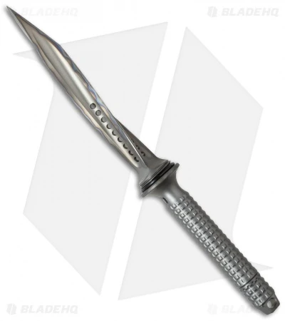 The Mini Jagdkommando follows the singular design of the regular Jagdkommando with solid single-piece titanium construction, but at just 55% of the original size. This titanium model has a bead blast finish with heat colored blade edges. The sharpened edges twist as they come to a point while the grooved faces feature drilled holes that flow seamlessly together. The hollow handle has a waffle texture that twists, mirroring the blade motif. Includes a threaded end cap with lanyard hole.