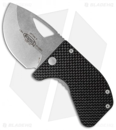 The Microtech Option II is a manual knife that is super slim and the size of a credit card. This knife has a polished carbon fiber handle with stainless framelock back. The blade is 154-CM steel with a stonewash finish and a plain edge.