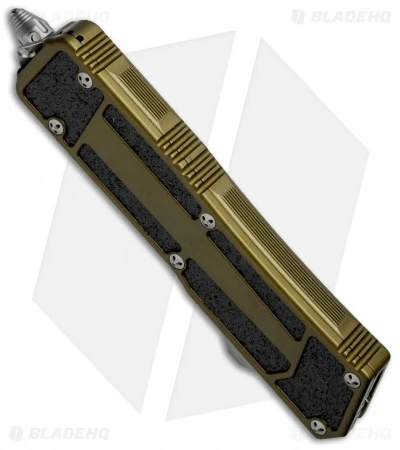 This Scarab has a drop point blade with a plain cutting edge and a stonewash finish. The OD green anodized 6061-T6 aluminum handle has grip inserts on front and back. The hardware, pocket clip and glass breaker are bead blast finished. Model information and Microtech logo on the blade with the Scarab logo on the pocket clip.