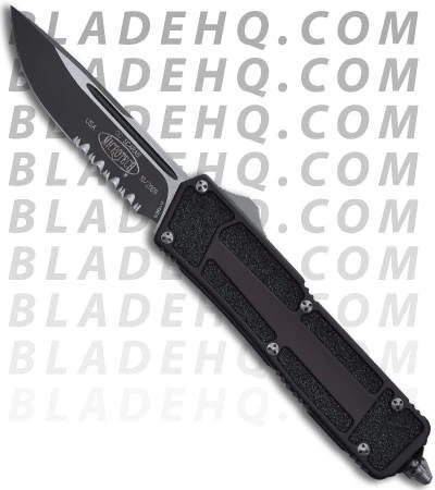 The Microtech Scarab is perhaps the mother of all out-the-front automatic knives. The Scarab is double action meaning is fires both out and in via the slide button located on the right side of the knife. Action, lock-up and quality are all Microtech-top-notch. The Scarab has a black two tone S30-V blade (partially serrated) and black anodized T-6 aluminum handle w/ grip-tech inserts. Pocket clip and glass breaker. The screws on this model require the Makora tri-wrench bit (click HERE) to remove or adjust.