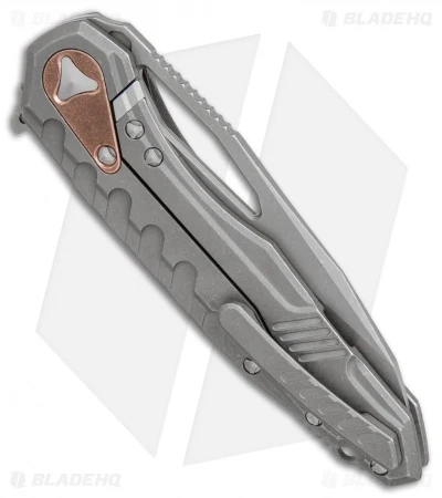 This Microtech Sigil features an Apocalyptic finished titanium handle with a copper plate on back. The Elmax steel blade has a matching Apocolyptic finish with a partially serrated edge.