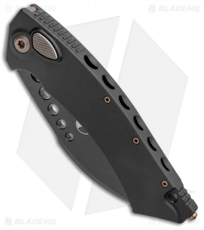 This Hawk model is built with a black anodized aluminum handle and a DLC coated blade with a plain edge and bronzed hardware.