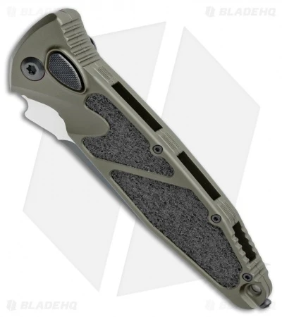 This Socom Elite automatic knife has an OD green anodized aluminum handle and a two-tone black and satin finished clip point blade.