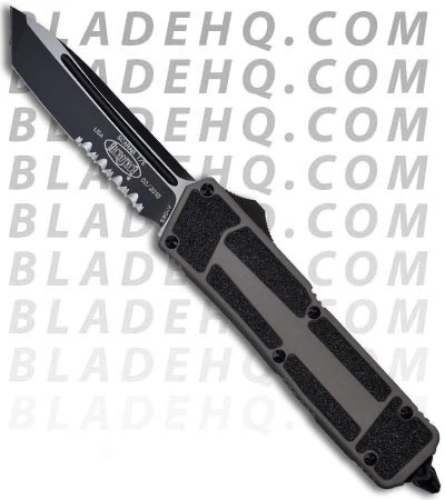 The Scarab is perhaps the mother of all out-the-front automatic knives. The Scarab is double action meaning is fires both out and in via the slide button located on the right side of the knife. Action, lock-up and quality are all Microtech-top-notch. The Scarab has a beautiful tanto two-tone black S30-V blade (partially serrated edge) and gun-metal grayanodized T-6 aluminum handles (with grip inserts). Black pocket clip w/ “Stealth” engraving.