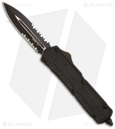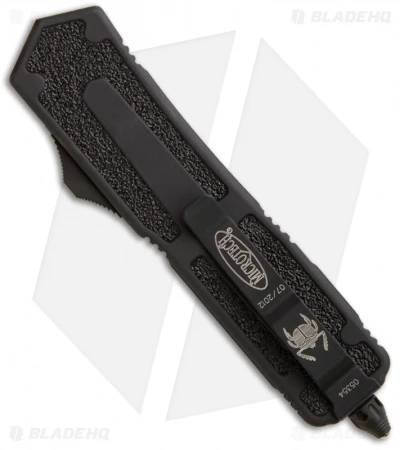 This Tactical Scarab has an S35VN stainless steel double-edged dagger blade with partially serrated edges and a two-tone finish (black grinds and satin flats). The black anodized T6 aluminum handle has grip inserts on front and back. The hardware, pocket clip and glass breaker are black finished. Model information and Microtech/Scarab logos are on the pocket clip.