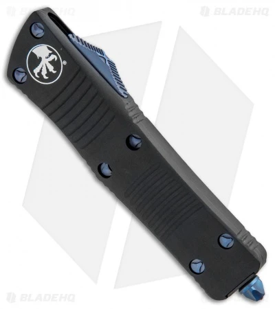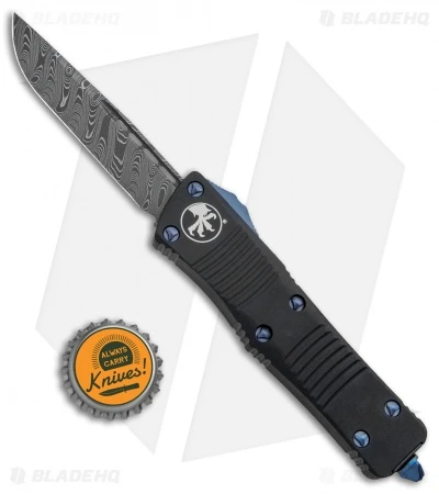 This model of the Microtech Troodon comes with a damascus blade and a black aluminum handle with blue ano titanium hardware.