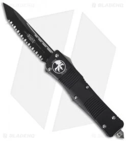 The Troodon handles are black anodized T-6 aluminum with grooves for added grip-ability. The tanto blade is Elmax steel with a black finish and a fully serrated edge. The knife includes a pocket clip and glass breaker & black nylon sheath.