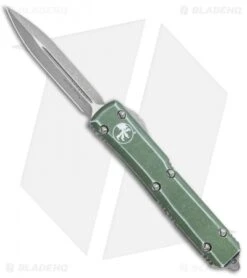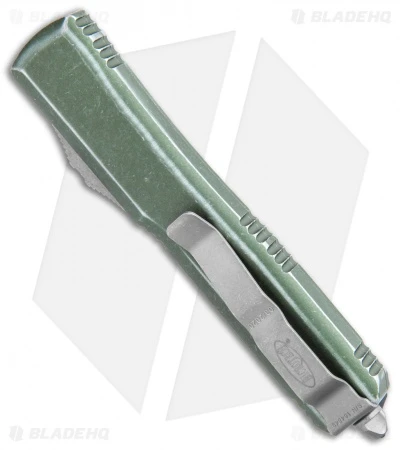 This Ultratech features a double-edged dagger blade with a stonewashed finish and plain cutting edges. It has a contoured, distressed OD Green anodized 6061-T6 aluminum handle with a bead blast finished pocket clip, glass breaker, and stainless steel hardware.