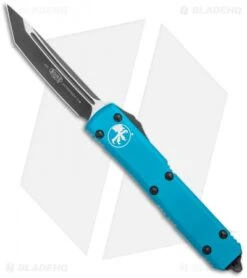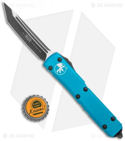 This Ultratech features a tanto blade with a black finish and a plain cutting edge. It has a contoured, turquoise anodized 6061-T6 aluminum handle with a black finished pocket clip, glass breaker, and stainless steel hardware.