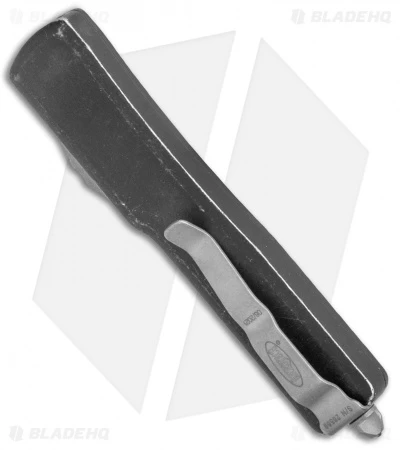 This UTX-70 features a distressed, black anodized aluminum handle. The drop point blade is an apocalyptic finished Bohler M390 stainless steel with plain edges. The pocket clip and hardware are apocalyptic finished.