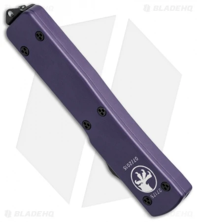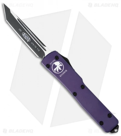 This UTX-70 has a two-tone finished tanto blade and purple anodized 6061-T6 aluminum chassis with black finished hardware and pocket clip.