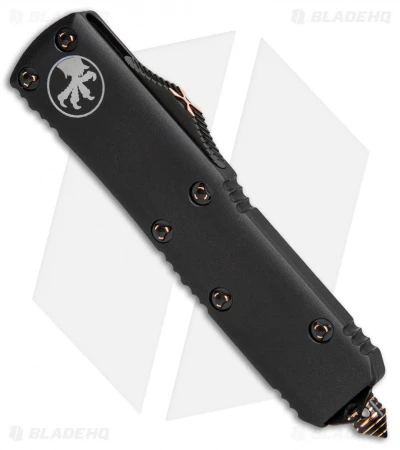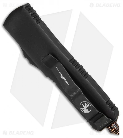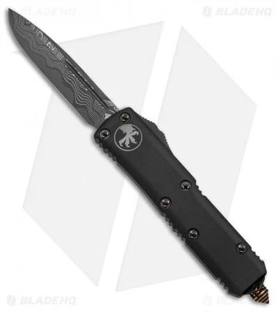 This Microtech UTX-85 is dressed to impress with a stunning damascus blade and two-tone copper hardware and glass-breaker. The handle has a matte black finish with a Microtech claw logo and a black stainless steel pocket clip.