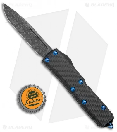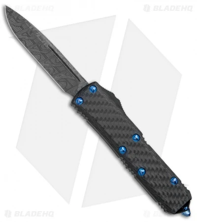 This UTX-85 model is dressed up with a Damascus steel blade. Its anodized aluminum handle sports a carbon fiber top scale, and comes fitted with blue anodized titanium hardware and a black finished pocket clip.