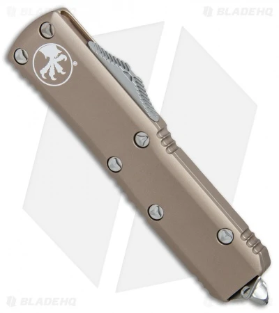 This UTX-85 model has a satin finished blade with a plain cutting edge. The 6061-T6 aluminum handle is tan anodized and outfitted with bead blast finished hardware, pocket clip, and glass breaker tip.