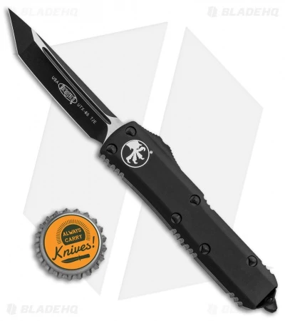 This UTX-85 model has a black finished tanto blade with a plain edge. The 6061-T6 aluminum handle is black anodized and outfitted with tactical black hardware, pocket clip, and glass breaker tip.