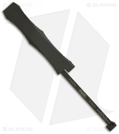 The Microtech Nemesis is a single-action out-the-front knife. The firing button is on the face of the handle with the safety below it. The Nemesis has a “liner-lock” type mechanism that secures the knife open.